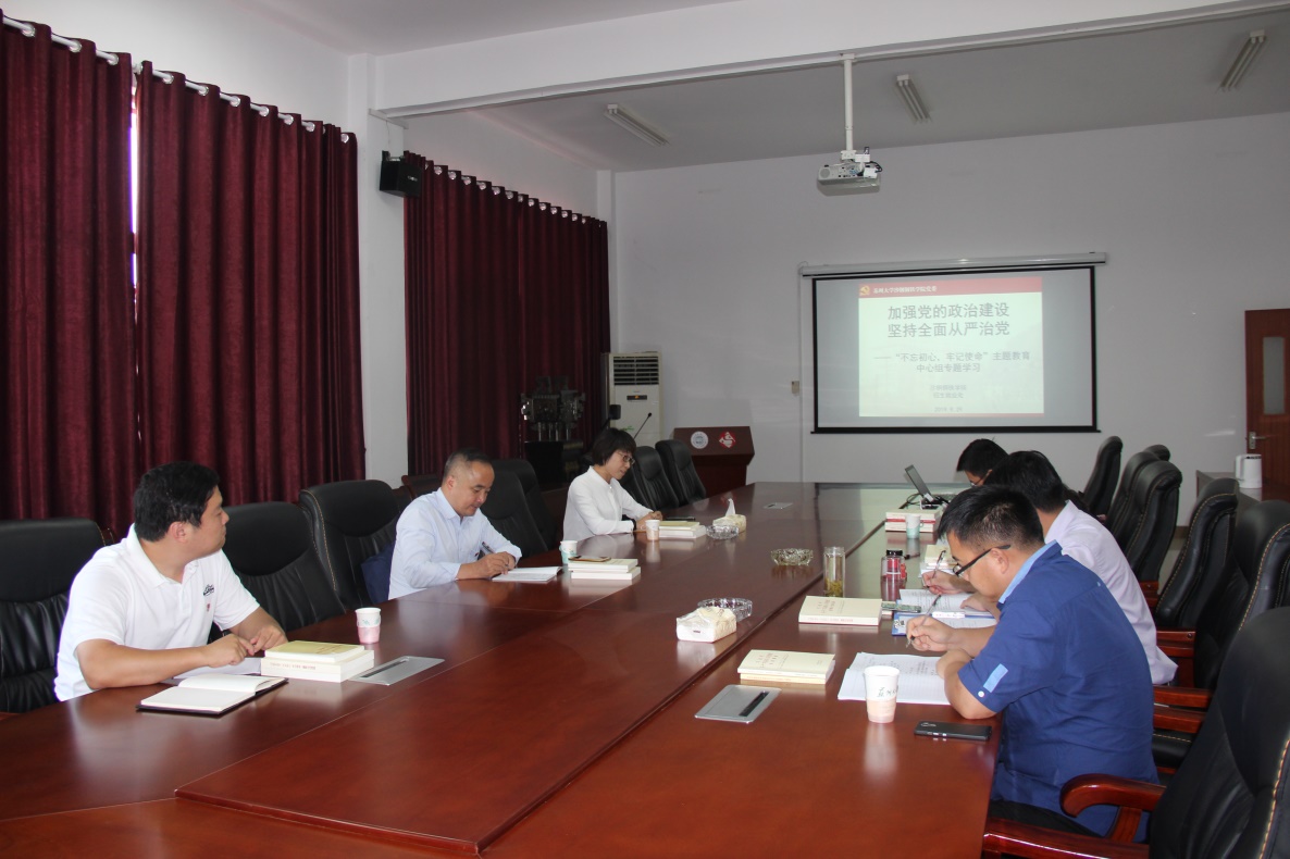 9月29日,学院理论学习中心组开展“不忘初心、牢记使命”主题教育,第二次集中专题学习“加强党的政治建设,坚持全面从严治党”。主题教育第七巡回指导组组长查佐明,招生就业处副处长张芸、副处长靳葛也一起参加了此次集中学习研讨,会议由院党委书记宋清华主持。