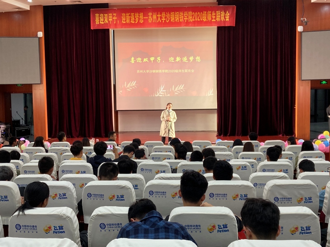 2020年10月17日晚7:00,喜迎双甲子,迎新逐梦想——苏州大学沙钢钢铁学院2020级师生联欢会在苏大阳澄湖校区图书馆大报告厅成功举行。苏州大学沙钢钢铁学院党委书记宋清华、辅导员、班主任参加了本次活动。恰逢苏大120周年校庆,希望沙钢学子秉承校训,传承苏大人精神,砥砺前进,奋进开拓,梦想再起航。