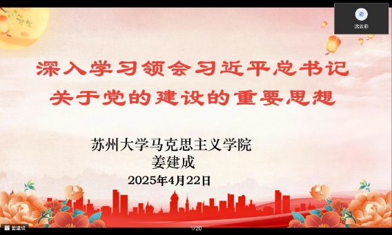 2025年4月22日,沙钢钢铁学院分党校邀请苏州大学马克思主义学院姜建成教授开设了主题为《深入学习领会习近平总书记关于党的建设的重要思想》的党课。学院党委书记沈云彩,党委副书记、副院长徐海洋,全体科职干部、辅导员、学生党员,2025年第一期预备党员培训班学员聆听了党课。党课由沈云彩主持。