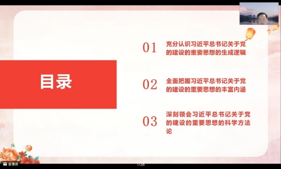姜建成教授围绕充分认识习近平总书记关于党的建设的重要思想的生成逻辑、全面把握习近平总书记关于党的建设的重要思想的丰富内涵、深刻领会习近平总书记关于党的建设的重要思想的科学方法共三个方面进行了深入解读。他指出,习近平总书记关于党的建设的重要思想理论逻辑来源于马克思主义建党学说,理解把握好党的建设的根本原则就是坚持和加强党的全面领导,坚持以党的自我革命引领社会革命。习近平总书记指出:“时代是出卷人,我们是答卷人,人民是阅卷人。”党的建设的重要思想离不开科学社会主义基本原理的运用,也离不开对中共党史、国际共产主义运动史知识体系的运用。我们要谨遵习近平总书记的教诲,以知促行,以行促知,做到知行合一。