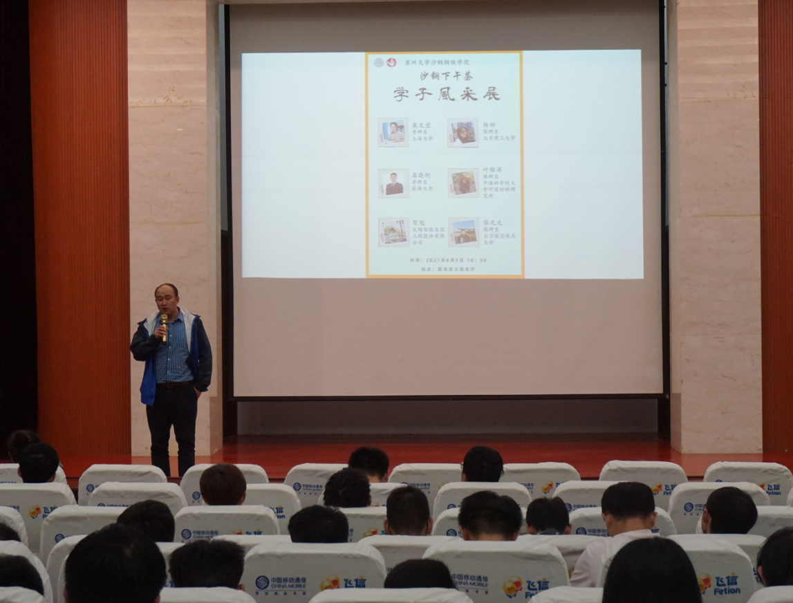 2021年6月3日晚上6点30, 沙钢下午茶之学子风采展在图书馆大报告厅举行。本次活动邀请到2021届6位优秀毕业生作为主讲嘉宾。我院全体大一、大二、大三学生参与活动。