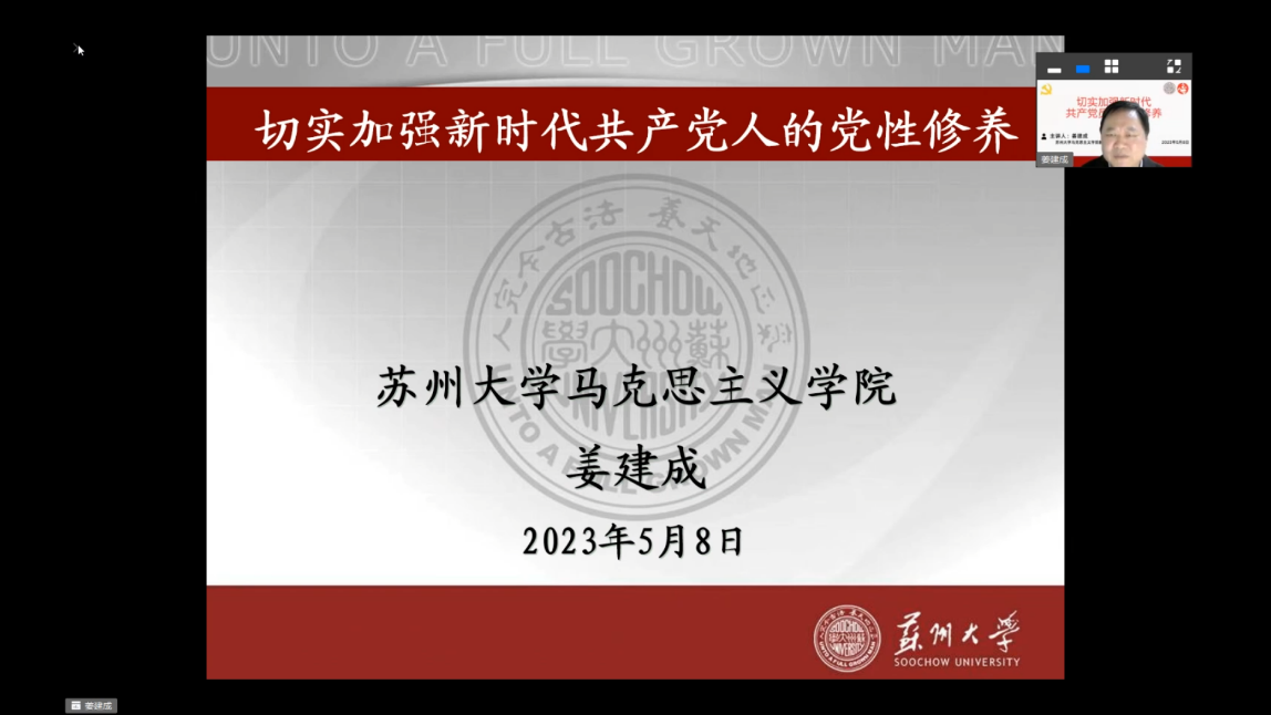 为引导青年党员加强党性修养,强化理论武装,坚定理想信念,坚持中国共产党的坚强领导,争做堪当民族复兴重任的时代新人,2023年5月8日,沙钢钢铁学院分党校邀请苏州大学马克思主义学院姜建成教授做主题为《切实加强新时代共产党人的党性修养》的党课。学院党委书记沈云彩,分党校秘书成苗,全体学生党员和2023年第一期党校培训班全体学员聆听了党课。党课由沈云彩主持。