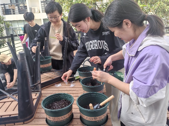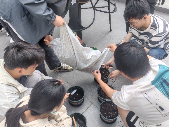 活动当日,同学们领取了自己选择的花种与花盆。随后,大家彼此配合,依次完成挖坑、施肥、撒种、盖土、浇水等种植步骤。种植完毕,每位同学在花盆上贴专属姓名贴,将承载希望的植物带回寝室,悉心呵护,静候生根发芽、繁花绽放。