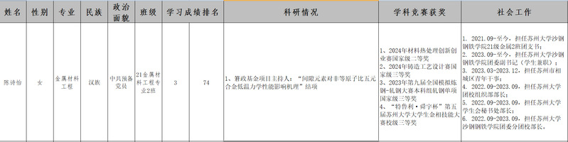 根据《教育部 财政部关于印发〈本专科生国家奖学金评审办法〉的通知》(教财函〔2019〕105号)、《省教育厅关于做好2024年普通高校国家奖学金有关工作的通知》(苏助中心〔2024〕27号)文件精神和《关于做好2024年本科生国家奖学金有关工作的通知》(学字﹝2024﹞75号),我院开展了2024年本科生国家奖学金评选工作。经学生本人申请、学院奖学金评审小组成员审核评定,现拟推荐我院2021级金属材料工程专业陈诗怡同学拟获2024年本科生国家奖学金。