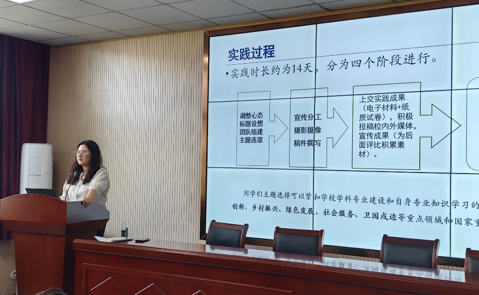 成苗详细介绍了本年度暑期社会实践的整体安排和具体要求。并对实践类型、组织方式、内容主题选择、时间进度安排、经费问题等关键环节进行说明。她特别强调了安全保障的重要性,要求同学们务必严格遵守安全纪律,提升风险防范意识与应急处置能力,确保实践活动安全、有序、有效进行。