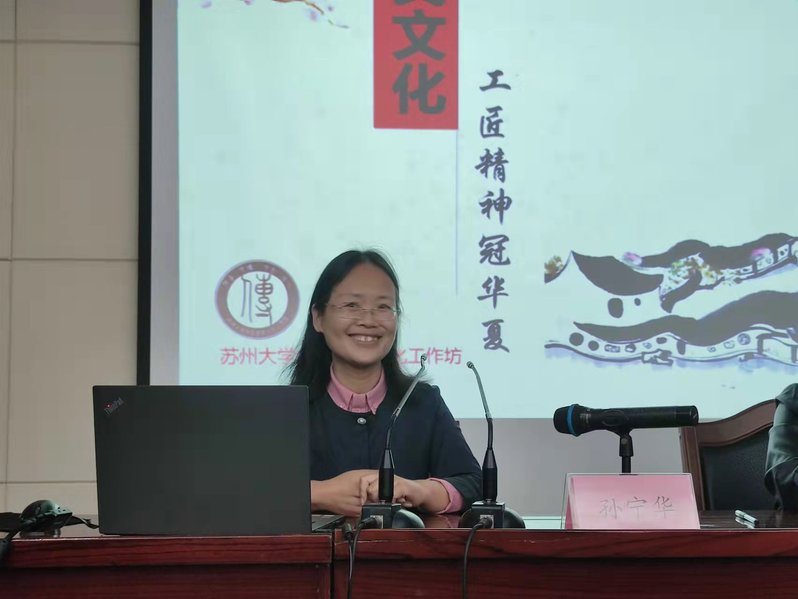 金秋十月,丹桂飘香,在美丽的阳澄湖图书馆一楼小报告厅中,沙钢学子以热烈的掌声欢迎文学院孙宁华书记的到来。宋清华说“身为苏大人,应知苏州事”,并向同学们简要介绍了苏州大学传统文化工作坊。她引用习近平总书记的话说:中国传统文化博大精深,学习和掌握其中的各种思想精华,对树立正确的世界观、人生观、价值观很有益处。学史可以看成败、鉴得失、知兴替;学诗可以情飞扬、志高昂、人灵秀;学伦理可以知廉耻、懂荣辱、辨是非。沙钢学子应好好学习中国传统文化,讲好中国故事,树立文化自信!