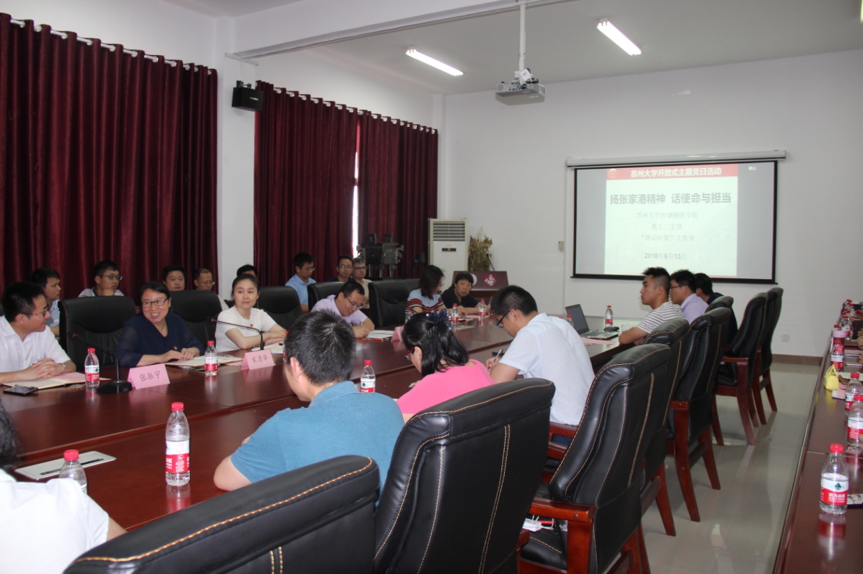 为深入贯彻落实习近平新时代中国特色社会主义思想和党的十九大精神,积极营造“不忘初心、牢记使命”主题教育的浓厚氛围,充分发挥党支部和党支部书记示范工作室的示范引领作用,切实提升组织生活的吸引力和实效性,2018年6月13日下午,苏州大学沙钢钢铁学院教二党支部开展了“扬张家港精神,话使命与担当”主题党日活动,沙钢钢铁学院党委书记宋清华、沙钢集团团委书记高梦婷、教二党支部全体党员和部分毕业生党员代表参加了本次活动。苏州大学党委组织部张振宇副部长、吴常歌老师、医学部和机电学院有关领导、党员以及沙钢学院教师一支部全体党员观摩了本次活动,活动由教二党支部书记章顺虎主持。