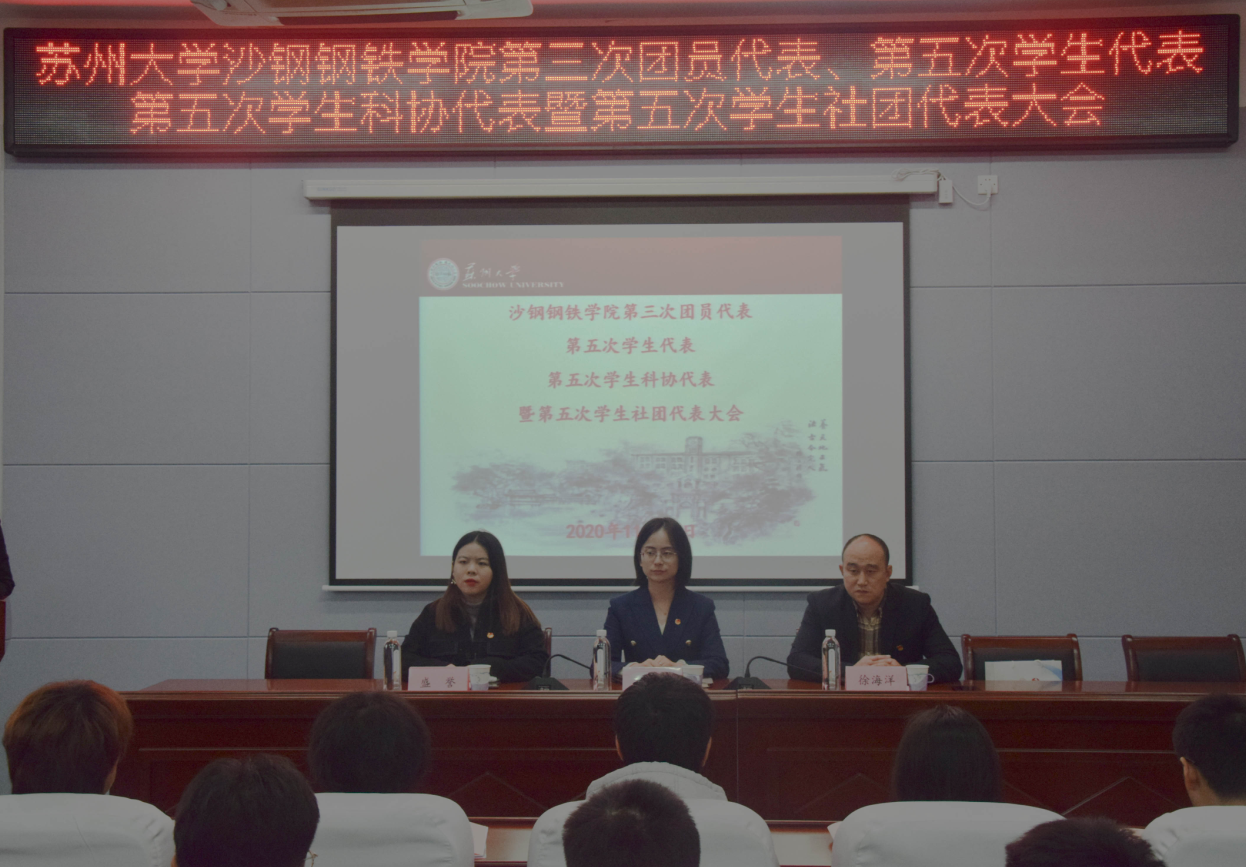 2020年11月25日下午1:30,苏州大学沙钢钢铁学院第三次团员代表、第五次学生代表、第五次学生科协代表暨第五次学生社团代表大会于冶金楼3102会议室顺利召开。苏州大学校团委副书记严韵致、苏州大学沙钢钢铁学院党委副书记徐海洋、苏州大学校社联阳澄湖管理中心主任盛誉及各兄弟学院代表出席了本次会议。
