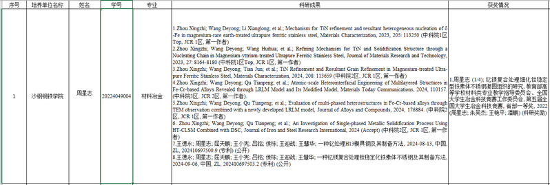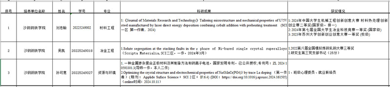 根据学校《关于做好2024年研究生国家奖学金(第二批)评审工作的通知》精神,结合《沙钢钢铁学院硏究生奖助学金评定细则》要求,学院严格规范程序、广泛宣传、积极动员,按照学生自愿申请、学院评审委员会公正评审的原则,圆满完成本年度国奖(第二批)初步评审,拟推荐博士周星志,硕士吴凯、刘忠翰、孙可意获评研究生国家奖学金(第二批)。具体信息如下: