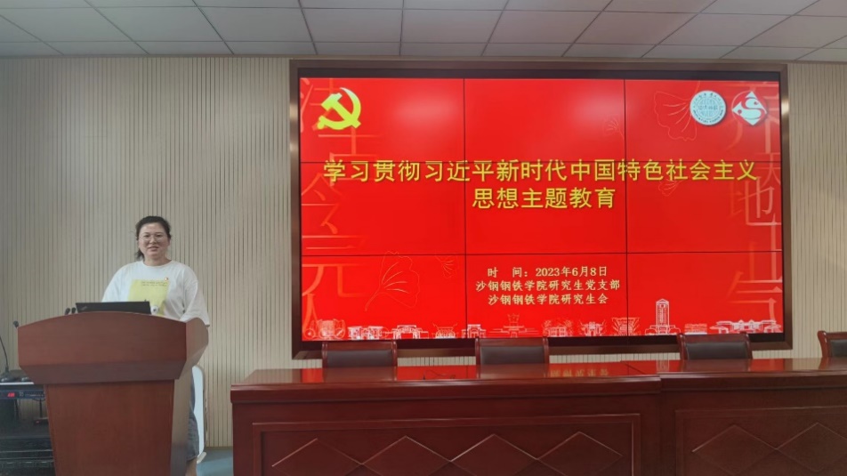 为推动全体研究生坚定自觉地紧跟习近平总书记奋进新征程,建功新时代,深入学习党的二十大报告,认真领悟党的二十大精神,2023年6月8日下午,沙钢钢铁学院研究生党支部联合院研究生会举行学习贯彻习近平新时代中国特色社会主义思想主题教育暨“学习践行二十大,砥砺奋进新征程”主题党日活动。全体研究生党员和同学参加,研究生党支部书记成苗作领学,会议由研究生党支部副书记魏珂正主持。