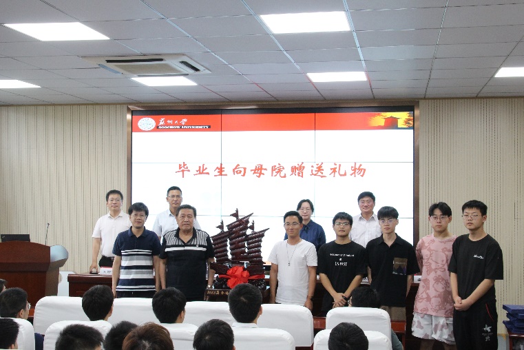 毕业生代表向学院赠送了纪念品,董元篪院长代表学院接受这一份来自毕业生的祝福,祝愿沙钢钢铁学院蒸蒸日上,再创辉煌。