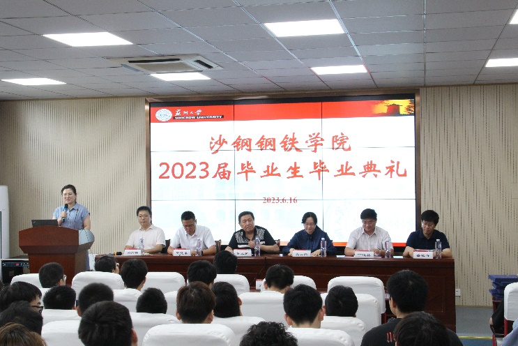 来日方长暂作别,循光而往踏歌行。2023年6月16日下午,沙钢钢铁学院2023届毕业生毕业典礼在冶金楼3102举行,学院院长董元篪,党委书记沈云彩,副院长王德永,副院长丁汉林,院长助理、资源循环科学与工程系主任国宏伟,冶金工程系主任盛敏奇,复合材料工程系主任宋滨娜,班主任张庆宇,毕业班辅导员成苗以及2023届全体毕业生参加了毕业典礼。毕业典礼由成苗主持。