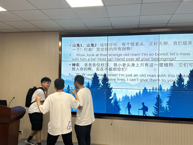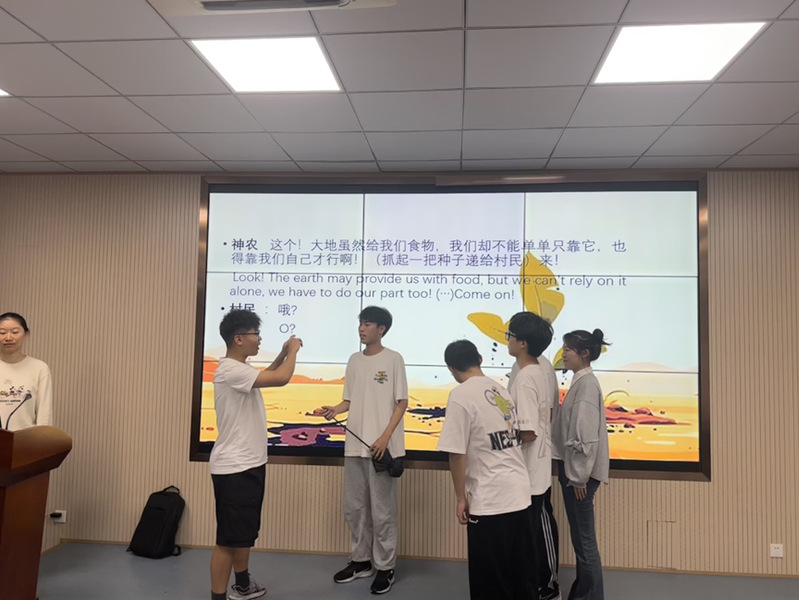 冶金2班带来的作品是《神农尝百草》, 话说在华夏文明的源头,有这样一段波澜壮阔的传奇。当人们饱受病痛折磨,神农心怀悲悯,毅然决然迈向那广袤神秘的山林。他以无畏之姿,穿梭于荆棘丛中,亲尝百草。每一口咀嚼,都可能是致命的危险,却也是生的希望。无数次与死神擦肩而过,只为探寻良药。他的身影,是勇气的象征,是大爱的化身。他的奉献如璀璨星辰照亮华夏大地。而当这样的中国传奇人物与英语短剧相结合,能否让人们更加印象深刻呢?