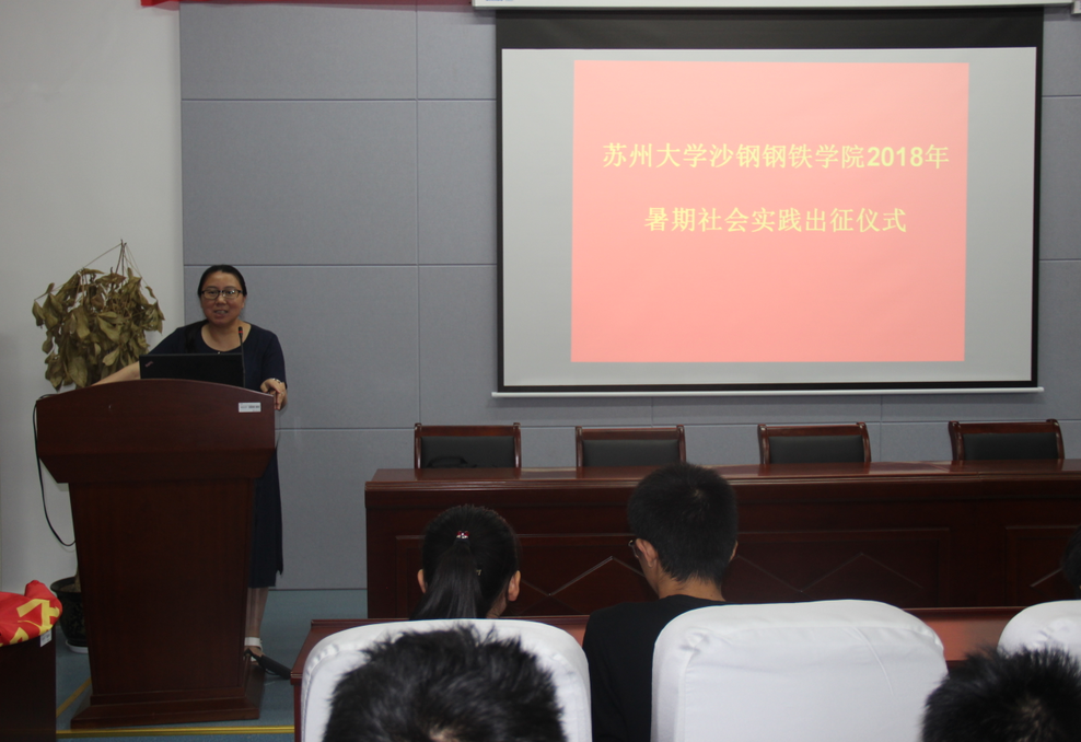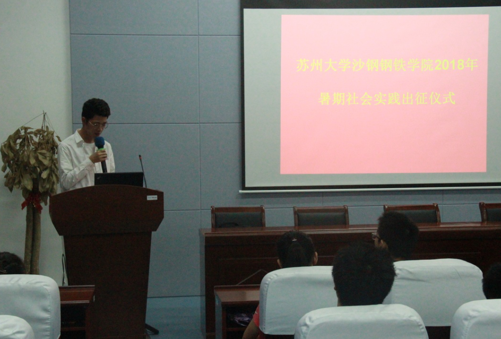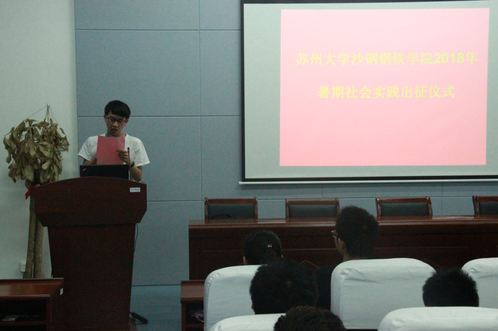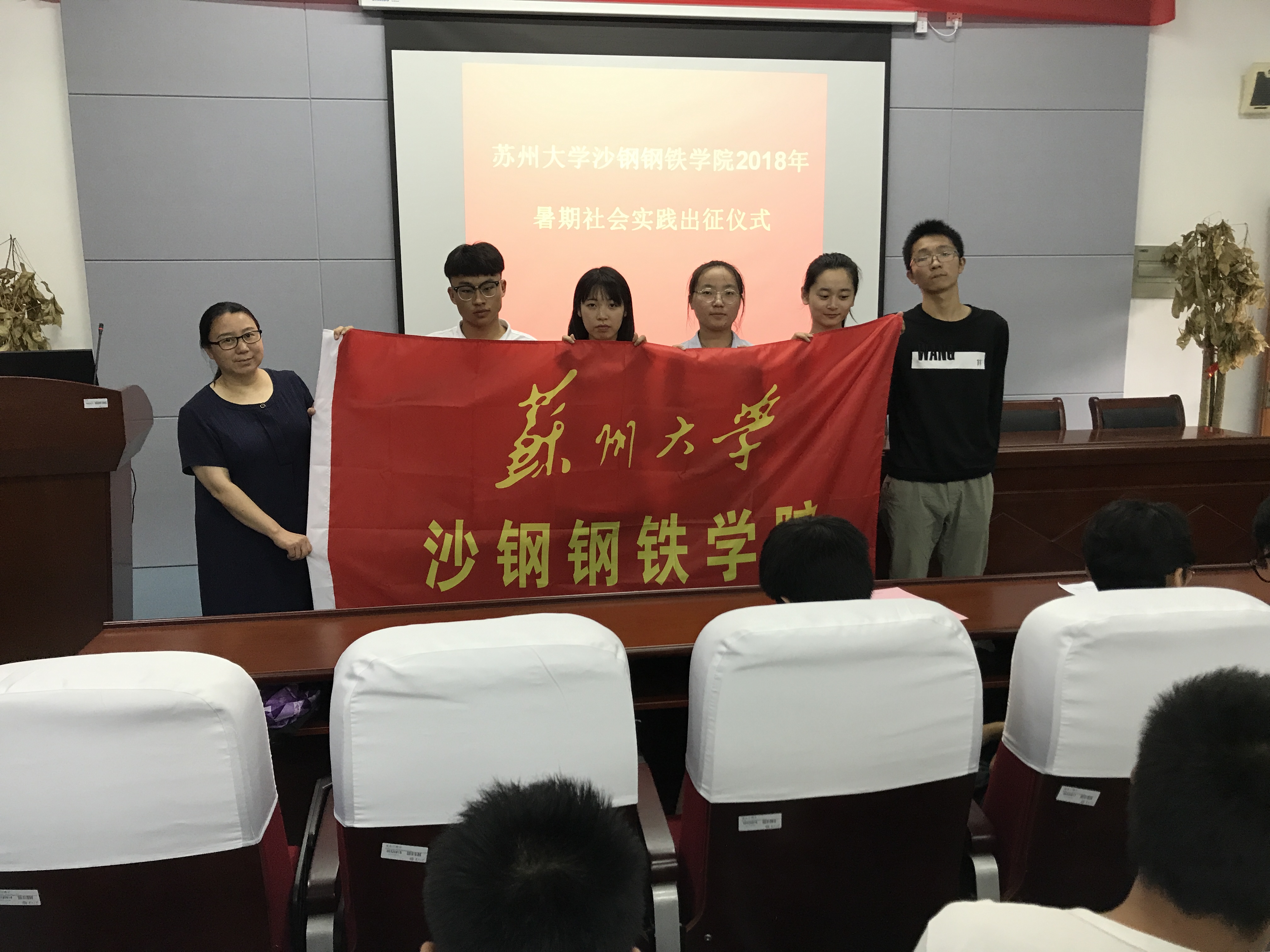 2018年7月5日下午4:30,苏州大学沙钢钢铁学院2018年暑期社会实践出征仪式在冶金楼3102会议室举行。学院党委书记宋清华参加仪式,仪式由学院团委书记郁佳莉主持。