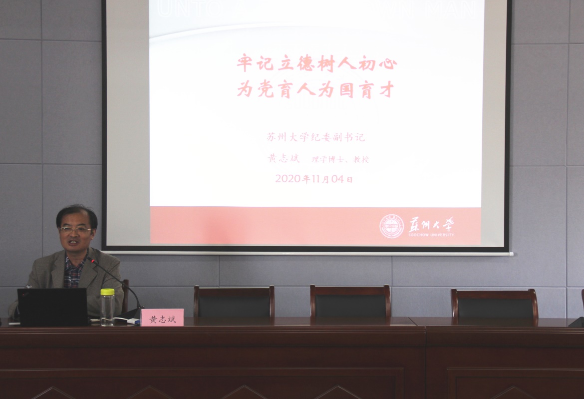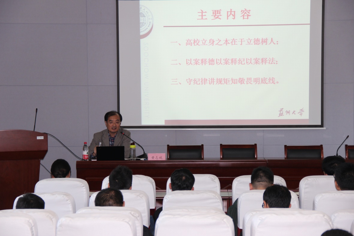 为全面贯彻落实党的十九大精神,构建师德师风建设长效机制,11月4日,学院召开加强师德师风建设专题学习暨党委理论学习中心组学习会,邀请校纪委副书记黄志斌做题为“牢记立德树人初心,为党育人为国育才”专题辅导报告。院党委书记宋清华主持,学院全体教职工及院党委理论学习中心组成员参加了此次专题学习。
