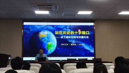 2023年9月20日下午,沙钢钢铁学院分党校邀请音乐学院副院长顾明高作了主题为《站在历史的十字路口——当下国际形势与中国外交》的党课。全体党校学员参加并认真聆听了党课。党课由学院党委副书记徐海洋主持。