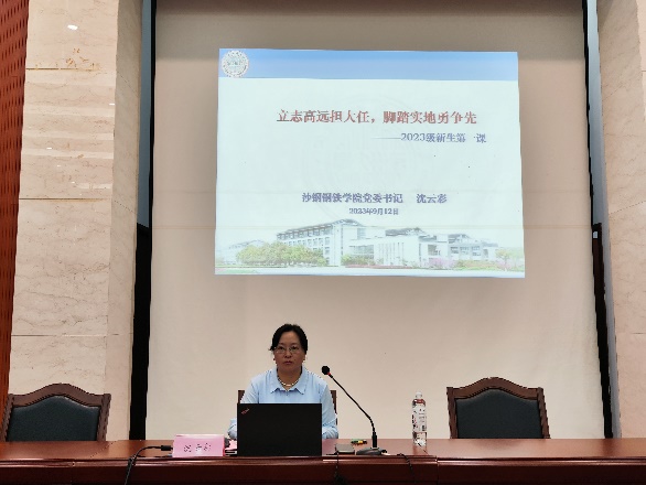 随后学院党委书记沈云彩为大家做了题为《立志高远担大任,脚踏实地勇争先》新生第一课,勉励同学们立大志,做力行者,为学院、为学校、为国家做出自己的贡献。