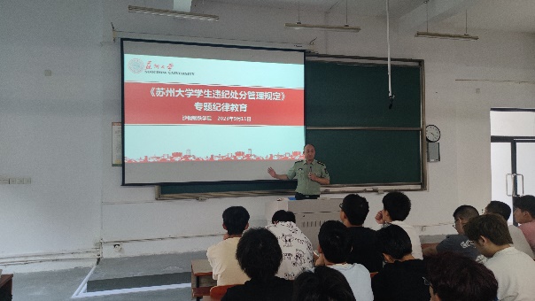 随后,学院党委副书记徐海洋为全体新生做校纪校规教育。他带大家系统地学习了《苏州大学学生管理规定》、《苏州大学学生违纪处分管理规定》等学生管理文件,他督促同学们要熟知学校的管理规定,遵守校规校纪,立志做到请党放心,强国有我。
