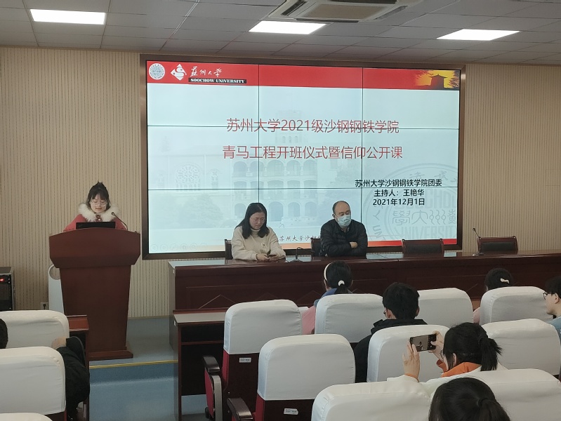 2021年12月1日下午,沙钢钢铁学院青马工程开班仪式暨信仰公开课在冶金楼3102顺利举行,学院党委副书记徐海洋和辅导员成苗出席会议,全体新上任学生骨干及新生班委参加会议,会议由分团校学生王艳华主持。