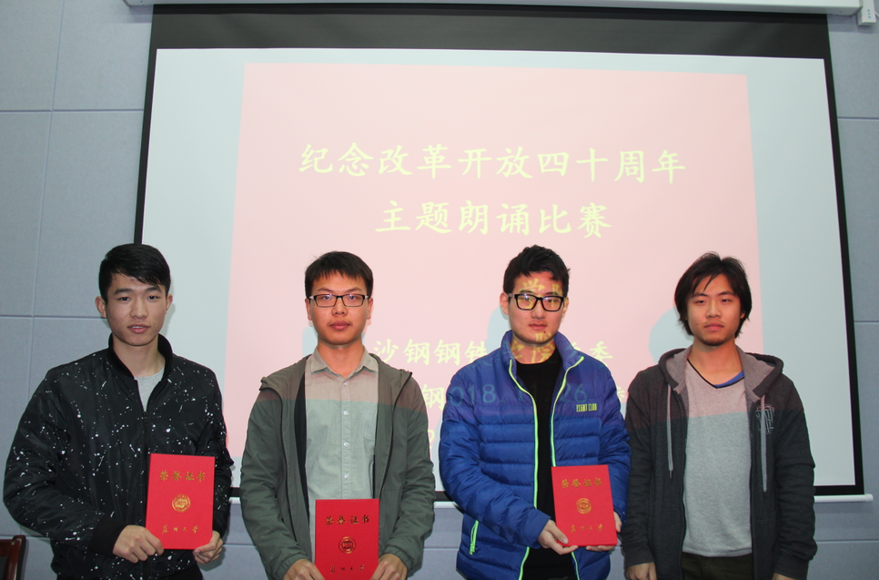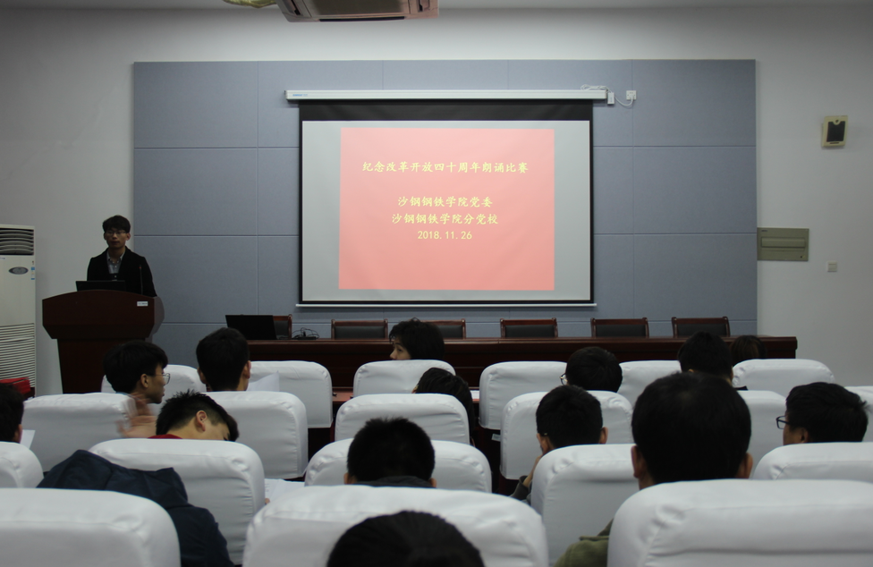 为了庆祝改革开放四十周年,培育和践行社会主义核心价值观,续写新时代中国特色社会主义崭新篇章,2018年11月28日,苏大沙钢钢铁学院分党校“庆祝改革开放四十周年”主题朗诵比赛在冶金楼3102会议室成功举办。全体党校学员参加活动,共8组参赛队伍。