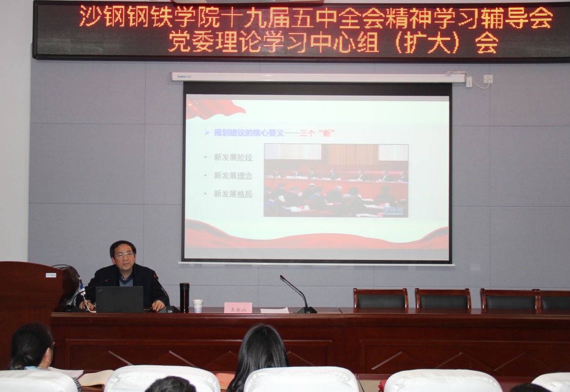 为了贯彻落实苏州大学党委《关于深入学习宣传贯彻党的十九届五中全会精神的通知》,将党的十九届五中全会精神融入学院教学科研工作中,2020年12月9日,学院召开十九届五中全会精神学习辅导会暨党委理论学习中心组(扩大)学习会,特邀校党委委员、工会主席王永山教授为全院教职工做专题学习辅导。会议由院党委书记宋清华主持。