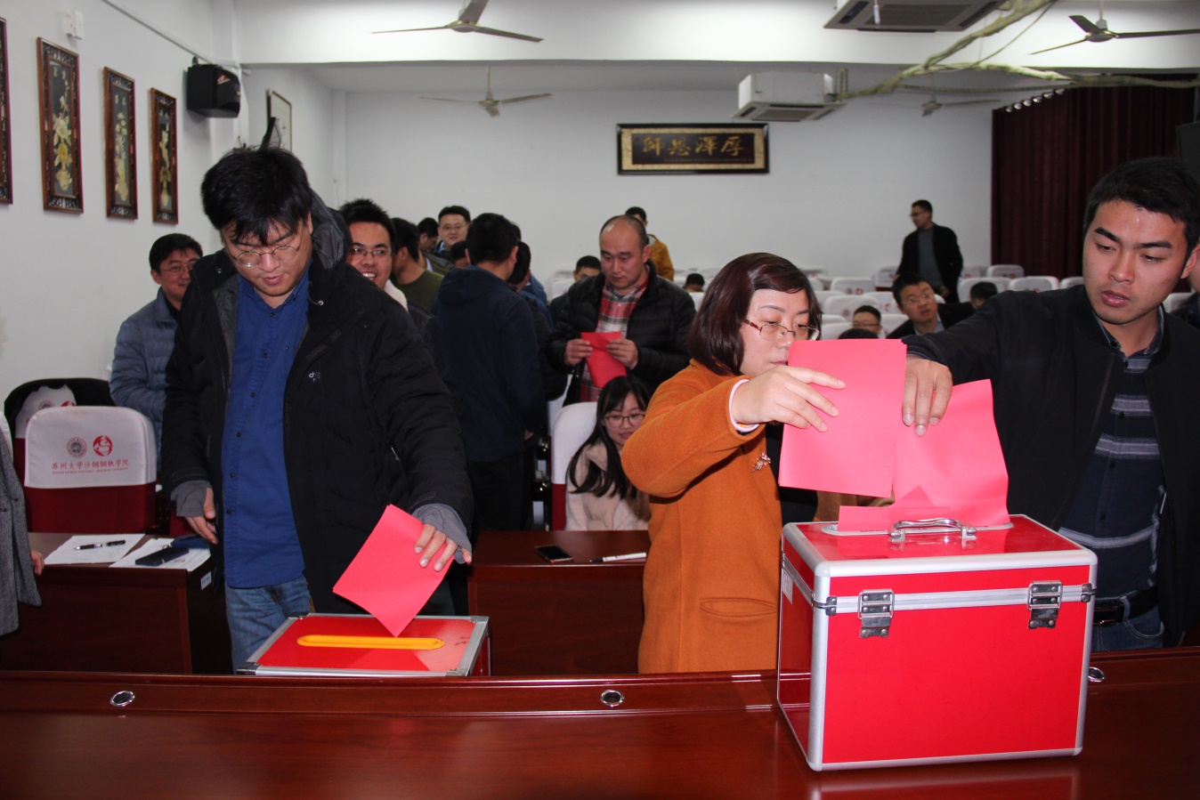 随后,工作人员宣读了《苏州大学沙钢钢铁学院分工会委员会选举办法》与新一届分工会委员候选人名单,大家均没有意见,一致鼓掌通过。大会以无记名投票的方式差额选举产生了新一届分工会委员会的5名委员,会后分工会经过无记名投票选出了新一届分工会主席,并对委员们进行了分工。