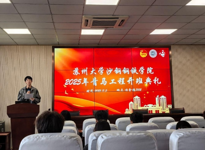 2025年11月5日下午,苏州大学沙钢钢铁学院2025年青马工程开班仪式在冶金楼3102举行。学院团委书记成苗出席本次会议,新一届学生骨干及各班班委参加活动。会议由24级冶金工程专业的韩钦宇同学主持。