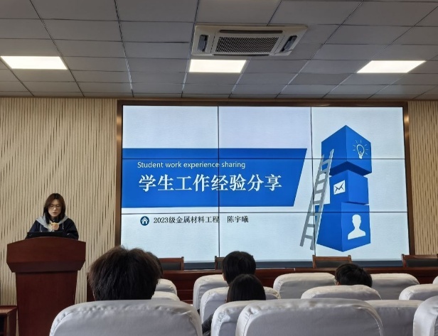 2023级金属二班班长陈宇曦向大家分享她的学生工作经验。从班级班长工作如何扎实有效开展,到学生会如何高效组织大家喜闻乐见的活动,她为新成员提出可借鉴建议,包括合理规划时间、保持积极心态、学会团结合作、加强与他人沟通等。