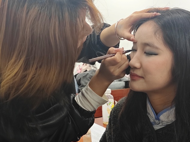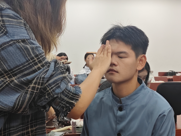 赛前化妆间里,化妆师们以匠心勾勒轮廓,用光影塑造气场。精致的妆容不仅让同学们以最佳形象登台,更唤醒了每个人心中的自信力量。镜前的少年们眼神愈发坚定,一身复古正装衬得身姿挺拔,等待着属于他们的舞台时刻。