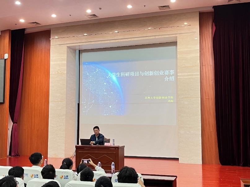 刘海详细给大家介绍了苏州大学特有创新创业体系——“一链三创五融合:。他详细给大家讲述了“三大赛”相关知识,包括赛程安排、参赛条件、参赛情况、获奖情况以及激励机制等。同时,刘海也悉心指导同学们如何备赛,从如何选择项目到如何组建高效率团队,并向大家传授了获奖经验要诀及注意事项。