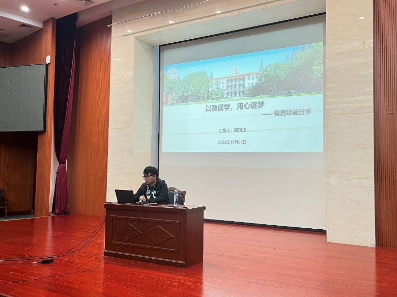 有着丰富竞赛经验的2022级研究生魏珂正,他不仅斩获了包括国一在内多个奖项,同时还是他们项目团队的核心,他首先为大家播放了一段视频,介绍团队产品——镁电池,接着,他以自身为例,讲述了参加竞赛对自身成长发展的帮助与助益,并鼓励了大家积极参加竞赛。他着重强调了不断试错与重视团队的重要性,希望大家能够勇往直前,不怕困难,同时也要正确处理团队关系。