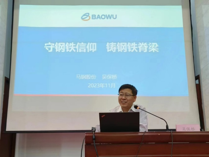 吴保桥所长以“守钢铁信仰,铸钢铁脊梁”为题,结合自己从一名普通的工程技术人员成长为马钢技术中心型钢所所长的成长历程,介绍了马钢热轧H型钢及相关产品的研发和生产过程。他带领科研团队直面挑战、攻坚克难,从成分设计到工艺开发、从现场生产到工程应用,逐步形成了H型钢的“马钢方案”,走出了一条“高效快捷、绿色环保、降本增效”的创新之路,填补了国内产品空白,助推国家“一带一路”战略向纵深发展。他鼓励同学们既要夯实专业基础、敢于创新、勇于攀登,又要甘于奉献、扎根一线,在平凡的岗位上书写不平凡的人生。