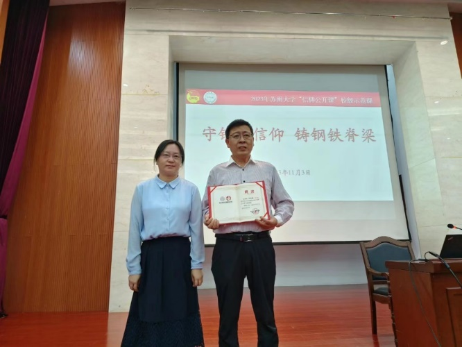 沈云彩为吴保桥颁发了苏州大学沙钢钢铁学院“信仰公开课”特聘导师证书。