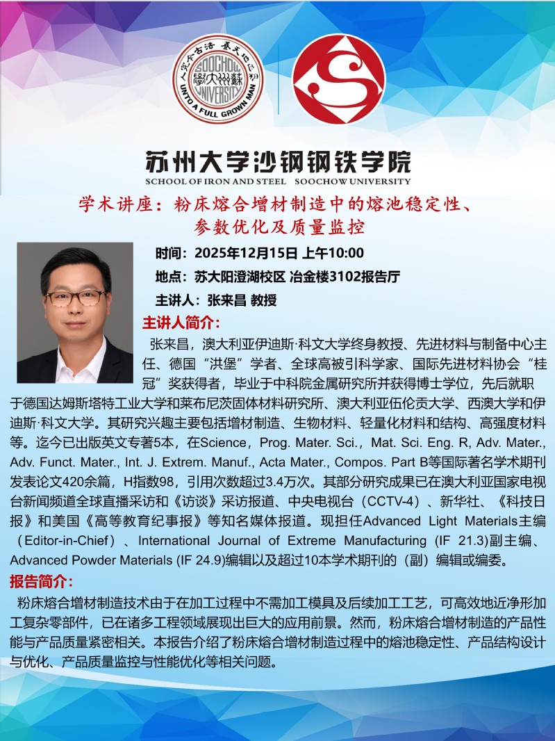 学术讲座:粉床熔合增材制造中的熔池稳定性、参数优化及质量监控