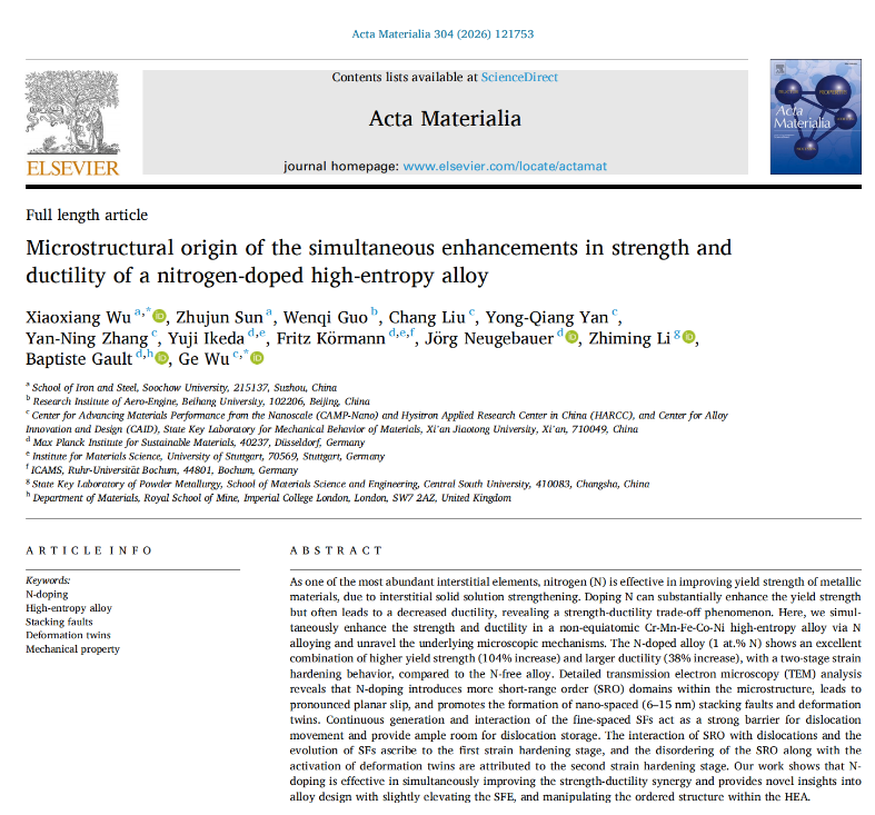 近日,我院吴小香老师团队联合西安交通大学和马克斯普朗克可持续材料研究所等单位在金属材料顶刊《Acta Materialia》上发表题为“Microstructural origin of the simultaneous enhancements in strength and ductility of a nitrogen-doped high-entropy alloy”的研究论文。苏州大学钢铁学院为第一单位和第一通讯单位。
