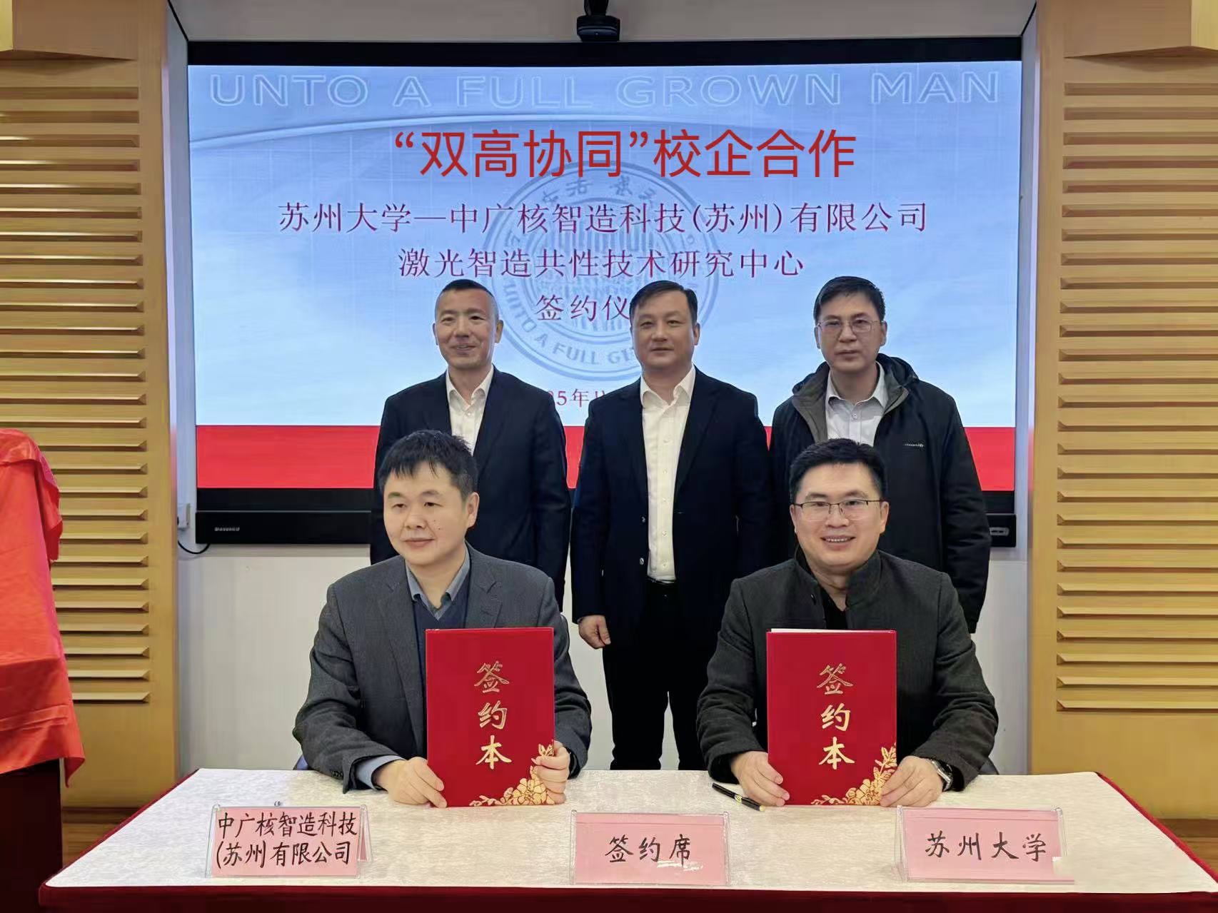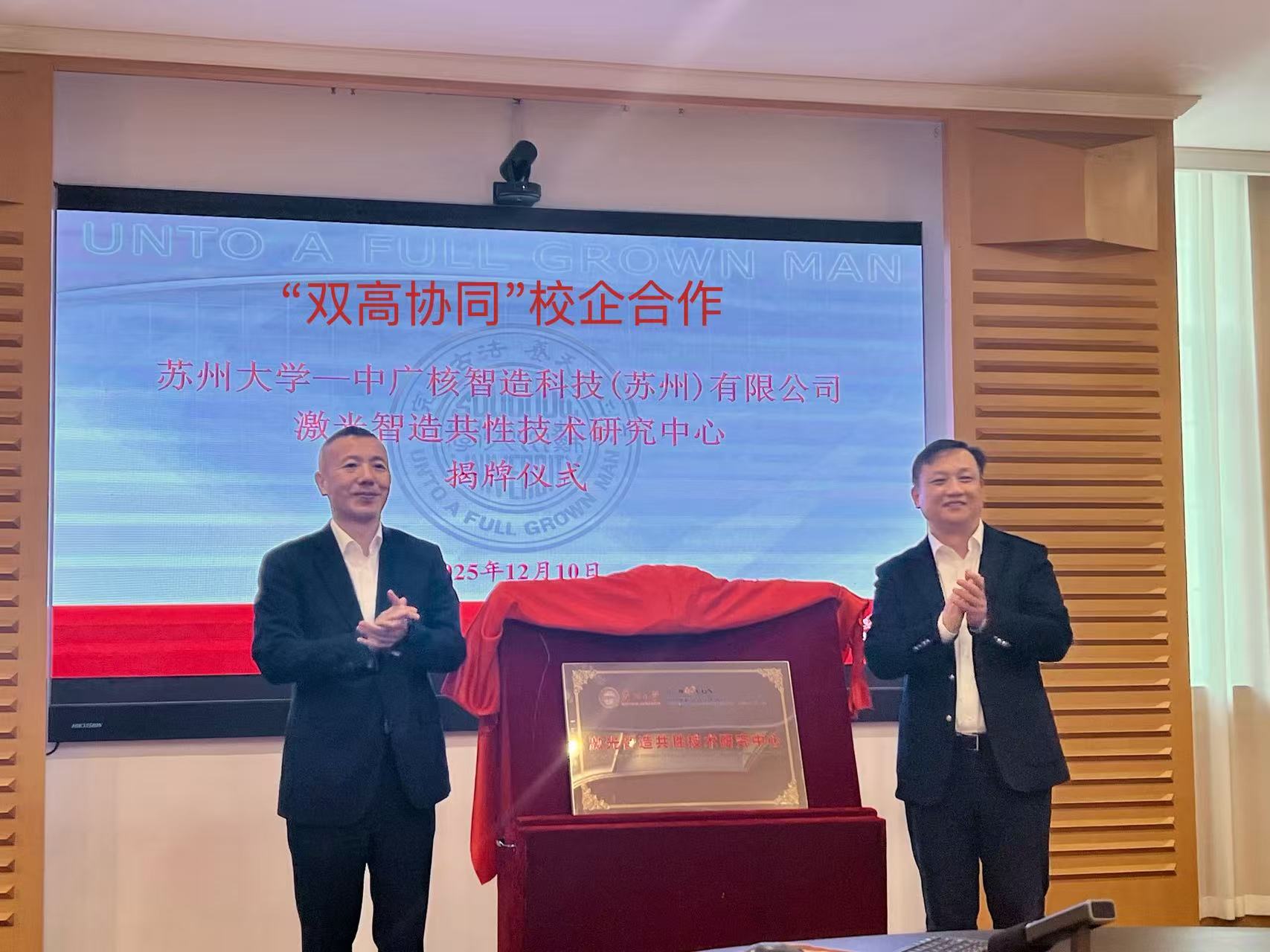 在深入贯彻江苏省“双高协同”工作部署推动下,12月10日,苏州大学-中广核智造科技(苏州)激光智造共性技术研究中心签约暨揭牌仪式在我校举行。我校党委常委、副校长张正彪,中广核苏州热工研究院有限公司党委委员、副总经理梁瞻翔出席并致辞,中广核智造科技(苏州)有限公司总经理鲁立等出席。会议由校科技党委书记刘开强主持。