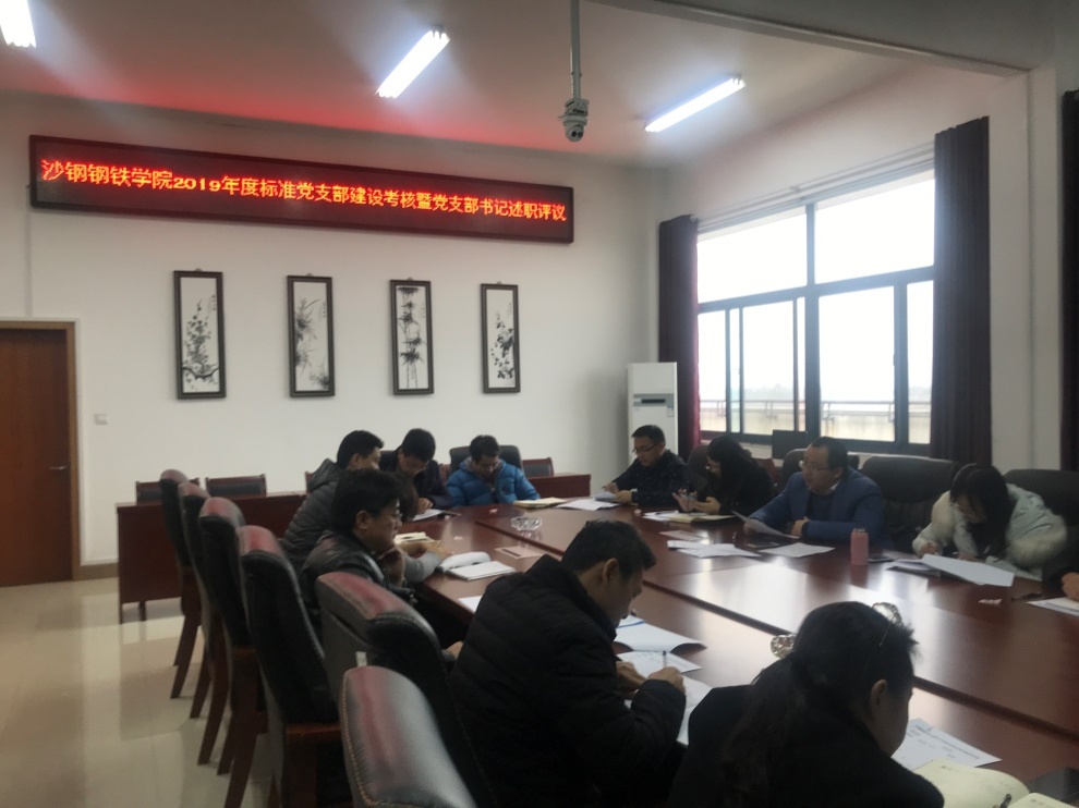 根据省委教育工委《关于贯彻落实中共江苏省委教育工委<新时代江苏高校党支部建设“提质增效”三年行动计划(2019-2021)>的通知》精神和学校《关于开展标准党支部建设考核工作的通知》要求, 为进一步提升学院党委基层党支部组织力,充分发挥基层党支部的战斗堡垒作用和党员的先锋模范作用,沙钢钢铁学院党委于12月4日开展了党支部书记述职评议暨标准党支部建设考核工作。各党支部书记参加述职,学院党委委员、领导班子成员、党支部委员以及专职组织员等参与考核评议,会议由院党委书记宋清华主持。