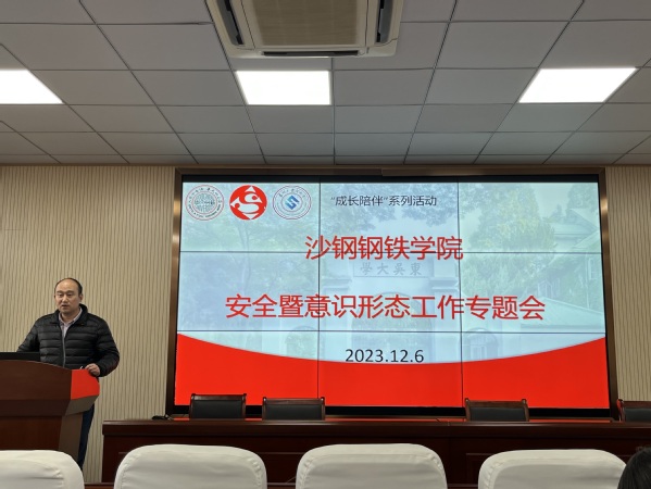 2023年12月6日下午,沙钢钢铁学院安全暨意识形态工作专题会在冶金楼3102举行。学院党委副书记兼副院长徐海洋,全体本科生、研究生心理委员及宿舍长出席会议,会议由本科生辅导员邹力子主持。