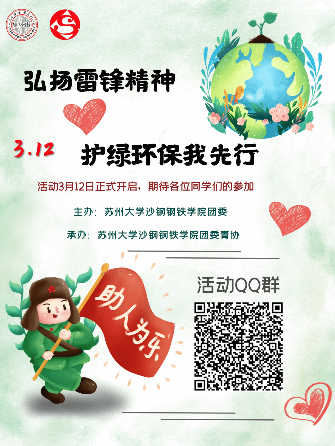 作品:具有雷锋精神或跟环保植树主题有关的作品,形式不限(可以是做志愿活动时的照片,摄影作品,画,手工作品等等,形式不限)