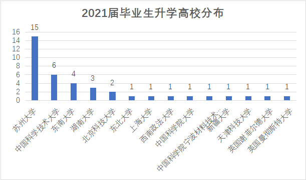 2021届本科生生源总人数86人,截至2022年3月,80人已落实毕业去向,6人待就业,总就业率93.02%。升学总人数39人,升学率45%,均为国内外知名高校。其中37人选择国内升学,2人选择出国。具体来看:本校读研人数最高,共15人,占升学总人数的38.5%;其次为中国科学技术大学,共6人,占升学总人数的15.4%。毕业生升学学校分布如下表所示。