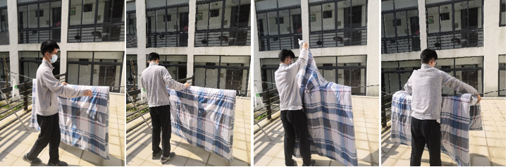 受疫情影响,我院本科生中只有18级金属2班的刘家鑫同学在校,他积极响应学院号召,主动帮寝室同学晾晒被子。“尽管校园实施封闭管理,但在这个阳光明媚的日子里,在这个以劳动为荣的假日里,我们进行了一次大规模的卫生清洁行动,不仅做清洁、晒被子,也清扫校园落叶,让整个校园都焕然一新了。”