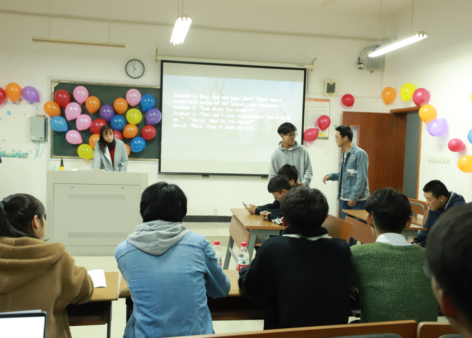 下午六点半,比赛正式开始。本次比赛共有三支参赛队伍,分别是18级冶金一班、冶金二班及金属二班。本次比赛的主持人由沙钢学院2018级新生任昱瑾及王一龙同学担任。本次大赛要求参赛队伍自备剧本英汉两份,ppt(内容包括剧本概况、成员简介及排练过程)。首先,由冶金一班的王恒龙同学以PPT形式介绍本团队的短剧故事简介。冶金一班表演主题为《死亡诗社》,这是由一部影视作品改编的英语短剧,他们希望通过自己的表演方式告诉同学们,要像Keating老师教导的那样,选择一条忠于自己内心并且有真正价值的路,用自己的节奏与步伐走好这条路,尽自己最大的努力与力气走到底,不管路上遇到怎样的阻力。冶金二班以《有声的利刃,无声的羔羊》为主题,他们通过生动的演绎,塑造了口吃者在日常生活中遇到的常人难以想象的伤害,这对他们的心灵造成了无法弥补的创伤,该作品引起了观众的共鸣。金属二班的短剧主题是《网上交友》,反映的是当代青年不愿于现实中与人交流而痴迷于网络交友的故事,并通过剧中“网友”的反差来达到表演效果,内容充实,剧情合理。