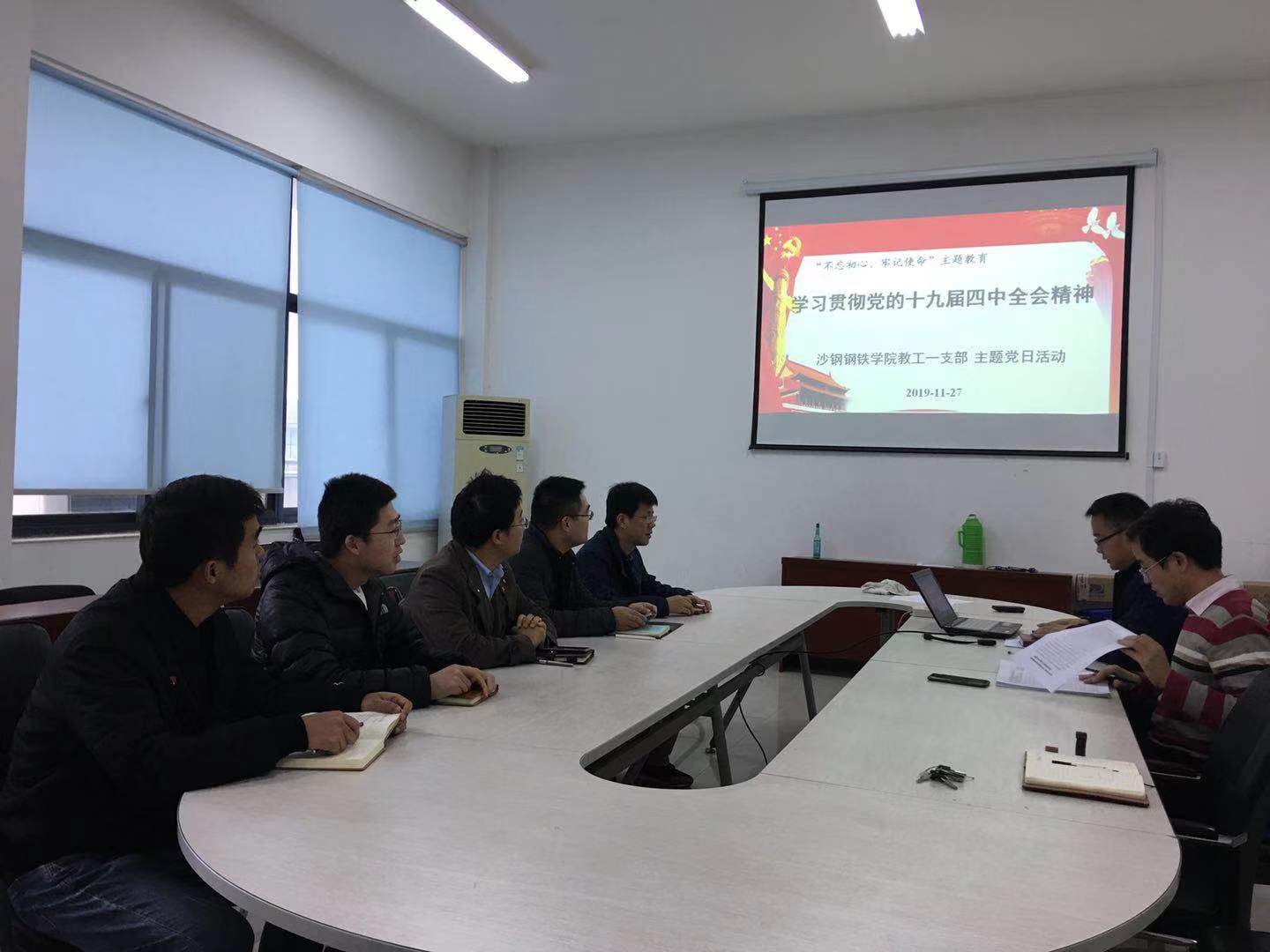 为贯彻落实党的十九届四中全会精神,按照“不忘初心、牢记使命”主题教育要求和学院党委工作部署,11月27日,沙钢钢铁学院教工一支部开展“学习贯彻党的十九届四中全会精神”主题党日活动,教工一支部全体党员参加本次活动,活动由教工一支部书记许继芳主持。