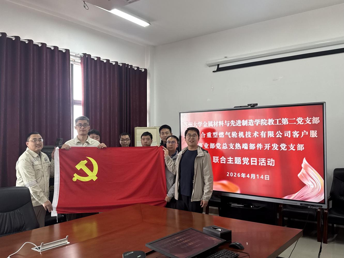 2026年4月14日下午,苏州大学金属材料与先进制造学院教工第二党支部与中国联合重型燃气轮机技术有限公司(中国重燃)热端部件开发党支部在苏大阳澄湖校区冶金楼4004会议室开展以“树立和践行正确政绩观学习教育”为主题的联合主题党日活动。教工第二党支部、中国重燃热端部件开发党支部共计10人参加了本次活动。活动由教工第二党支部书记张庆宇主持。