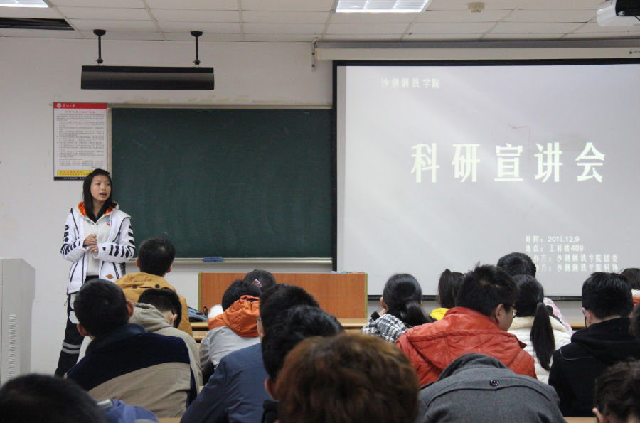 2015年12月9日下午2:30,沙钢钢铁学院科研宣讲会在工科楼409召开。本次宣讲会邀请到了沙钢钢铁学院副院长钟胜奎教授以及在之前的科研项目中表现优异的郭瑞琪学姐和郝月莹学姐。