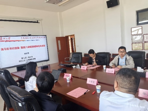 张庆宇主讲了题为《锲而不舍落实中央八项规定精神》的微党课,要求党员同志要以习近平总书记关于加强党的作风建设重要论述为指引,扎实开展深入贯彻中央八项规定精神学习教育。杨菲菲作了题为《党建引领促发展·清风护航谱新篇》的报告,列举了违反中央八项规定精神的典型表现,也提出了要将廉洁文化溶于企业和校园文化、清风护航推动高质量发展的美好愿景。报告结束后,大家一起观看了保密宣传教育微视频《保密,其实就在你我身边》。