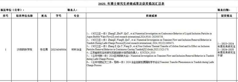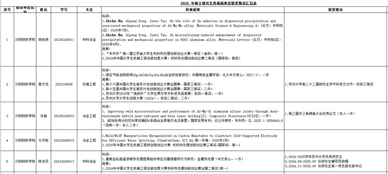 根据学校《关于做好2025年研究生国家奖学金评审工作的通知》要求,结合《沙钢钢铁学院硏究生奖助学金评定细则(2025年修订版)》要求,学院严格规范程序,按照学生自愿申请、学院评审委员会公正评审的原则,圆满完成本年度国奖初步评审,拟推荐张志霄获得博士研究生国家奖学金,拟推荐胡世虎、蒋文龙、许超、令天皎、陈志贤获得硕士研究生国家奖学金。具体信息如下: