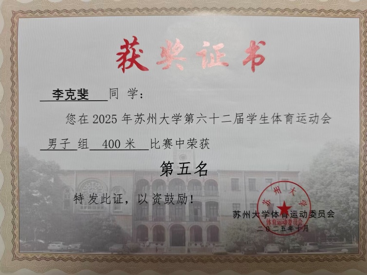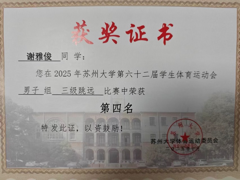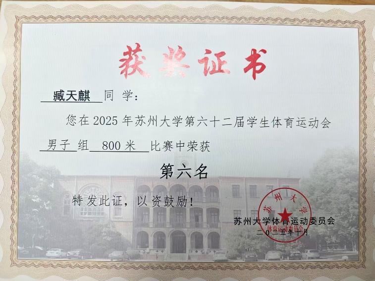 在我院学子的共同努力下,今年取得了重大突破,所有成绩的取得是对他们付出最好的勉励。在男子400米的赛场上李克斐取得了第五名的好成绩,谢雅俊同学在三级跳中取得了第四名的好成绩,臧天麒于男子800米比赛中取得了第六名的好成绩。今年,我们院取得了团体总分第十五名的成绩,实现重大突破。