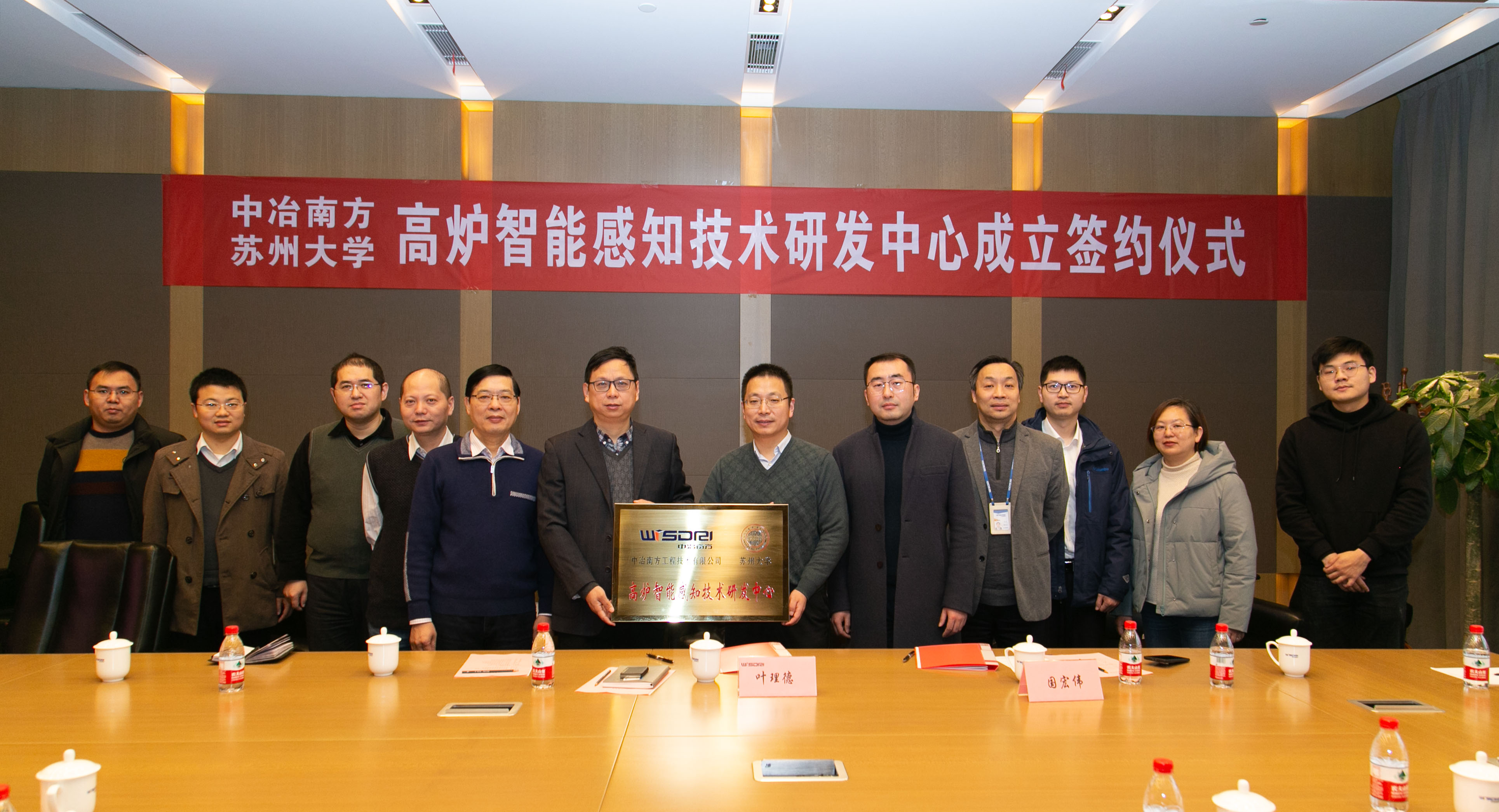 1月3日上午,我校与中冶南方工程技术有限公司联合共建的“苏州大学-中冶南方高炉智能感知技术研发中心”揭牌仪式在武汉市中冶南方公司总部举行。中冶南方公司副总经理潘国友、钢铁公司副总经理乔军、技术研究院院长叶理德、炼铁分公司总经理秦涔等,我校沙钢钢铁学院教授国宏伟、副教授闫炳基以及科技成果转化处副处长田天参加了签约仪式。