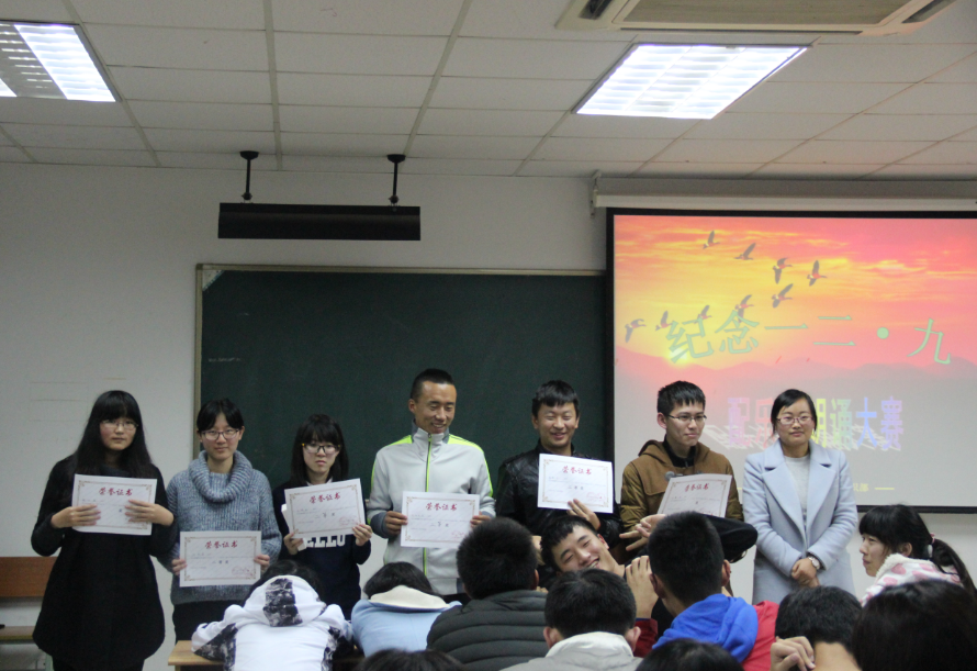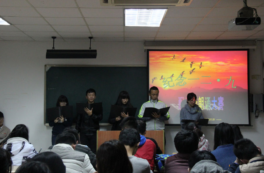 2015年12月9日晚6:30,沙钢钢铁学院纪念“一二·九运动”配乐诗朗诵大赛在工科楼205教室举行。担任此次活动评委的有辅导员郁佳莉老师,团委副主任吴贵菁、学生会主席郝月莹、科协理事长王心怡以及社联副主席施嘉伦。